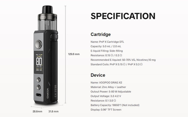 The standard cartridge for DRAG X2, PnP X Cartridge DTL , is the only one for the global and its compatible coil resistance is 0.15ohm and 0.3ohm. The standard coils are PnP X 0.15ohm and PnP X 0.3ohm. It is recommended to choose the e-liquid with 50%-70% VG and whose nicotine content of no more than 10 mg.