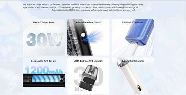 The Ace of the URSA Family – URSA NANO 3 features distinctive finishes and superior craftsmanship, perfectly complementing your vaping style. It offers a 30W max output and a 1200mAh...