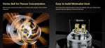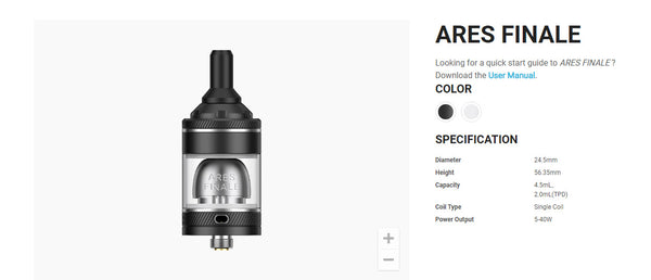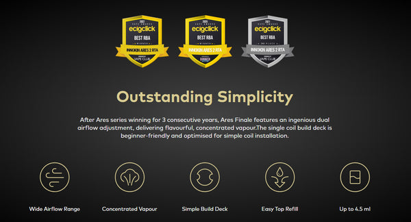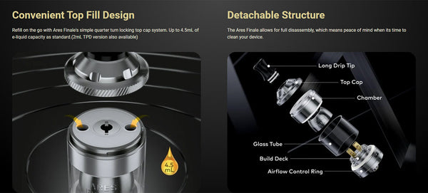 يتميز خزان Innokin Ares Finale RTA Vape بأنه خزان RTA (خزان قابل لإعادة البناء) مصمم بعناية فائقة، ويلبي تفضيلات التدخين الإلكتروني (MTL) و (RDL) . يتميز الخزان بخاصية تعديل تدفق الهواء المزدوج، مما يتيح للمستخدمين تخصيص تجربتهم باختيار إعداد تدفق الهواء المفضل لديهم. بسعة تصل إلى 4.5 مل من السائل الإلكتروني، يضمن الخزان مدة تدخين مُرضية، كما أن تصميمه الذي يتيح إعادة التعبئة العلوية بربع دورة يسمح بإعادة التعبئة بسهولة وسرعة.