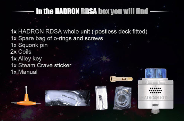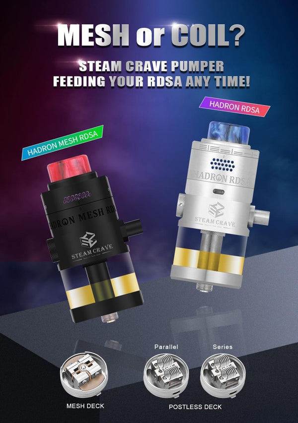 صُمم جهاز Hadron RDSA بسطح مبتكر وبسيط بدون أعمدة، مناسب للتركيب المتوازي والمتسلسل. يمكنك تركيب ملفات بقطر داخلي يتراوح بين 3.0 مم و5.0 مم. يتميز بتدفق هواء قابل للتعديل من الجانبين والأسفل. يدعم Hadron RDSA أيضًا التبخير بقوة واط متوسطة إلى عالية. بالإضافة إلى ذلك، يمكنك ضغط السائل حتى 12 مل بدقة وثبات باستخدام مضخة Steam Crave (تباع منفصلة).