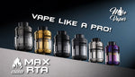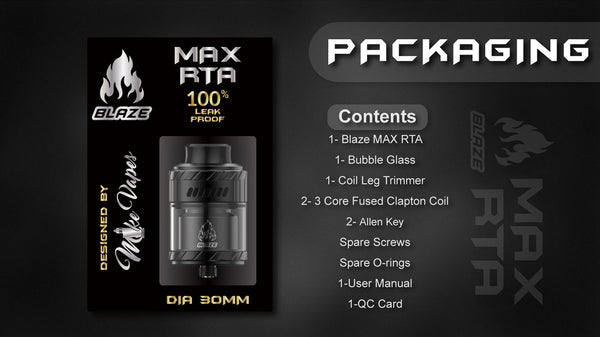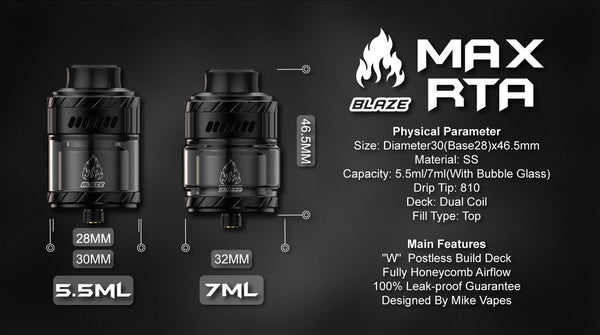تم تصميم Blaze MAX RTA بواسطة Mike Vapes الشهير بالتعاون مع ThunderHead Creations، وهو خزان مزدوج الملف يبرز في مجتمع vaping.