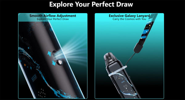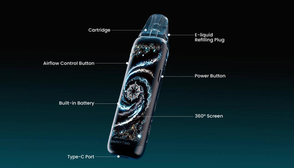 The Lost Vape Galaxy T360 Pod Kit offers the same revolutionary 360 degree Galaxy Screen in a slimmer, tube-shaped design for ultimate portability. Powered by a 1200mAh built-in battery, it delivers 5W–30W output and supports Single Mesh & Dual Mesh modes for tailored vaping experiences. The 0.8ohm Ursa V3 Top Filling 2.5ml Cartridge ensures rich flavor and easy refills, while adjustable airflow caters to both MTL and RDL users. The vibrant circular display keeps you informed with battery status, resistance, puff count, and mesh mode at a glance. With Type-C fast charging, lightweight design, and a lanyard included, the Galaxy T360 is your stylish companion for vaping on the move.