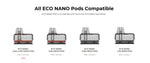 The Vaporesso Eco Nano Pod is power by 1000mAh internal battery. A new 6ml 0.6ohm lush mesh pod and COREX Smooth technology consistently deliver smooth taste and extend pod life....