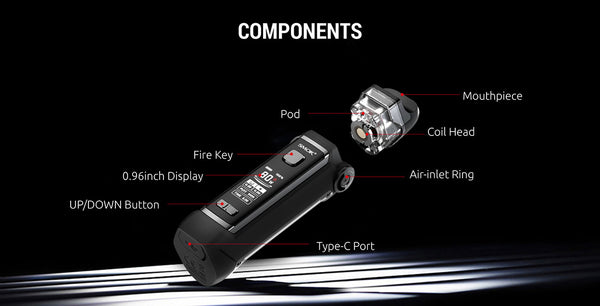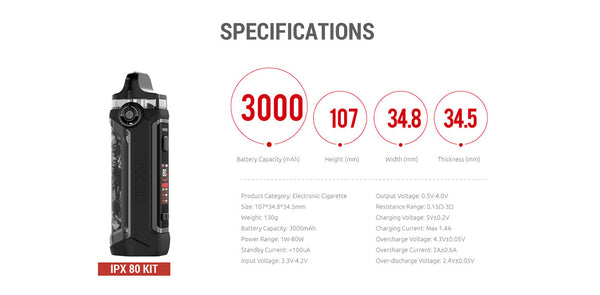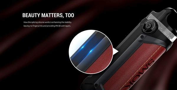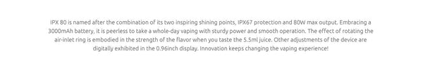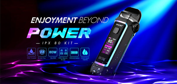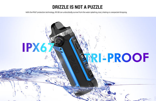 The Smok IPX80 Pod Kit name is the combination of its two inspiring shining points, IPX67 protection and 80W max output. Embracing a 3000mAh battery, it is peerless to take a whole-day vaping with sturdy power and smooth operation, The effect of rotating the air-inlet ring is embodied in the strength of the flavour when you taste the 5.5ml juice. Other adjustments of the device are digitally exhibited in the 0.96inch display. Innovation keeps changing the vaping experience.