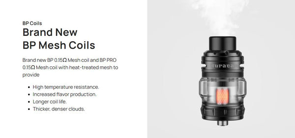 خزان هوراكان بسعة 6 مل من السائل، مع إمكانية إعادة التعبئة بسهولة. ستجد في العبوة ملفًا شبكيًا من نوع BP بمقاومة 0.15 أوم، يعمل بقوة تتراوح بين 80 و100 واط، وملفًا شبكيًا من نوع BP بمقاومة 0.3 أوم، يعمل بقوة تتراوح بين 30 و40 واط. إذا لم يُرضِ هذان الملفان أسلوبك في استنشاق البخار، فهناك ملفان اختياريان أيضًا.