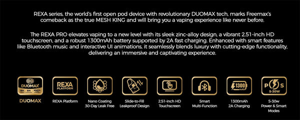 مجموعة نظام فري ماكس ريكسا برو بود هي أحدث خط إنتاج من سلسلة فري ماكس ريكسا، وتتميز ببطارية مدمجة بسعة 1300 مللي أمبير/ساعة قابلة للشحن فائق السرعة، وسعة سائل فائقة تبلغ 3 مل، وقوة إخراج قصوى تبلغ 30 واط. كما أنها مزودة بشاشة كاملة تعرض بيانات مهمة، بما في ذلك قوة الإخراج وعدد السحبات ومقاومتها. وتوفر سبع وسائل حماية لتستمتع بتجربة تبخير رائعة. مع عمر افتراضي طويل ونكهة فائقة الجودة، ستكون تجربة التبخير الخاصة بك استثنائية ورائعة.