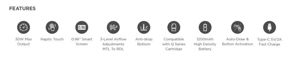 يتميز جهاز Geekvape Wenax Q Pro بالأداء مع ملف 0.4 أوم يدعم ما يصل إلى 30 وات من الطاقة وثلاثة مستويات تدفق هواء قابلة للتعديل، لتلبية تفضيلات vaping MTL و DTL. تدعم البطارية المدمجة ذات السعة العالية 1200 مللي أمبير في الساعة الشحن السريع 5 فولت/2 أمبير، مما يحسن الراحة وطول العمر بشكل كبير. وهي متوافقة مع خرطوشة Q Series Pod.