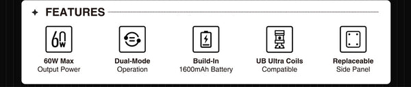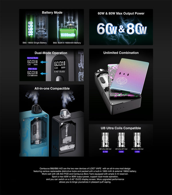 طقم Lost Vape Centaurus B60 AIO، الذي يوفر نطاقًا من 5 إلى 60 واط، وشريحة Quest 2.0، وجهاز UB Ultra Coil المتوافق مع UB AIO Pod لإنتاج البخار. مصنوع من الفولاذ المقاوم للصدأ المتين وسبائك الزنك، يُعد طقم Centaurus B60 AIO النسخة الأصغر من طقم B80 AIO Boro. مزود ببطارية مدمجة بسعة 1600 مللي أمبير/ساعة، نطاق إنتاج 5 إلى 60 واط مثالي لمن يرغبون في استخدام ملفات UB Ultra Coils. مع جهاز UB AIO Pod، يُقدم جهاز Centaurus B60 بخارًا غنيًا ونكهة غنية من سائلك الإلكتروني أو أملاح النيكوتين المفضلة.