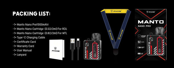 نظام رينكو مانتو نانو برو بود هو خط إنتاج جديد من سلسلة رينكو مانتو، مزود ببطارية مدمجة قابلة لإعادة الشحن بسعة 1000 مللي أمبير/ساعة، وسعة سائل تبخير 2 مل، ومفتاح لتدفق الهواء، وقوة إخراج قصوى تبلغ 25 واط. يتميز مانتو نانو برو بتصميم أنيق وسهل الحمل، ومناسب تمامًا لحقيبة يدك أو راحة يدك. سعة سائل التبخير 2 مل كافية للاستخدام اليومي. يتميز بقطعة فم مريحة متطورة ونطاق تدفق هواء قابل للتعديل، مما يوفر تبخيرًا بتقنية MTL وRDL. يتميز رينكو مانتو نانو برو بأنه متعدد الاستخدامات، ويمكنه استيعاب سائل إلكتروني بقاعدة حرة وملح النيكوتين. تتيح لك الكبسولات الشفافة التحقق من مستوى السائل الإلكتروني بسهولة ويسر.