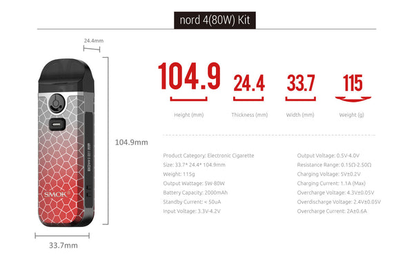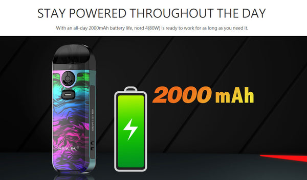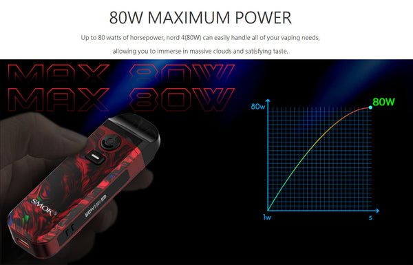 سموك نورد 4 (80 واط) هو نظام بودات مميز متعدد الإمكانيات، يُمكّنك من الاستفادة القصوى من أداء ومزايا الجهاز. يحتوي على بطارية مدمجة بسعة 2000 مللي أمبير/ساعة، تكفي لتوفير طاقة قصوى تبلغ 80 واط. يأتي الطقم مع بودين نورد 4 بسعة 4.5 مل، أحدهما مزود بملف شبكي RPM 2 والآخر بملف شبكي RPM. كما يتميز بحلقتي مدخل هواء مصممتين بذكاء في الجزء العلوي من الجهاز لضبط كمية الهواء الداخلة بحرية. نصنع هذا الجهاز المذهل لك، وأنت تملكه. الابتكار يُغير تجربة التدخين الإلكتروني باستمرار!