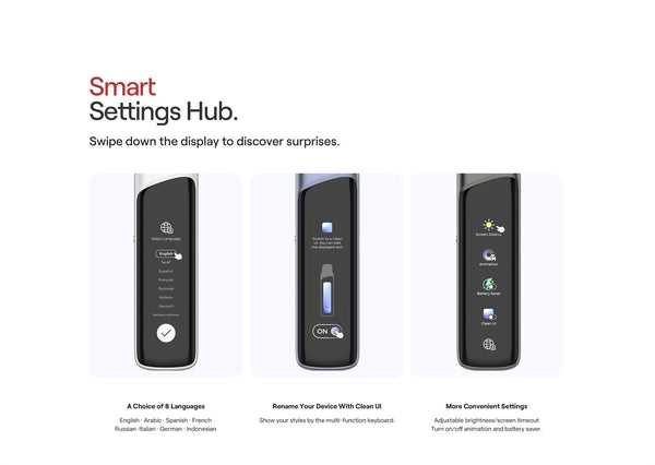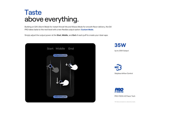 The standout feature is its 2.51-inch shatterproof display, offering one-touch control for all core functions, from wattage adjustment to puff counter reset. Users can enjoy 3 preset themes and 3 unlockable UI themes, customize the device name, and operate in 8 supported languages. The G4 Pro also introduces 3 intelligent vaping modes (Storm / Waves / Custom), stepless airflow control, and the latest Pro-FOCS 4.0 flavor technology, all packed in a sleek, durable body.