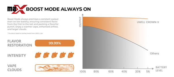 يتميز نظام Uwell Crown X Pod بقدرة قصوى تبلغ 60 واط، وملف 0.3 أوم، ليقدم تجربة تبخير مثالية مباشرة من الجهاز بنكهة أكثر غيومًا وكثافة. يوفر وضع التعزيز دائمًا خرجًا ثابتًا، مما يضمن نكهة ثابتة من أول نفخة إلى آخرها. مع هذه الميزة المتقدمة، يصبح تبخير sub-ohm أكثر قوة. تغمر براعم التذوق بنكهة غنية مع كل نفخة. يمكنك تجربة تبخير أكثر دفئًا، وتدفق هواء أكبر، وسحب أكبر.