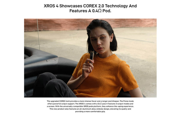 جهاز Xros 4 هو أفضل جهاز بود جديد من عائلة Xros، وهو الخيار الأمثل للنكهة والقوام، من تجربة MTL القوية إلى RDL. تخطى حدود MTL وRDL مع البود الجديد 0.6 أوم ووضع النبض من Axon Chip، وهو متوافق أيضًا مع جميع أجهزة Xros. تخطى حدود النكهة القوية مع تقنية التسخين Corex، وتجاوز حدود التصميم والموثوقية مع قطعة الفم المُحسّنة ومؤشر البطارية النيون.
